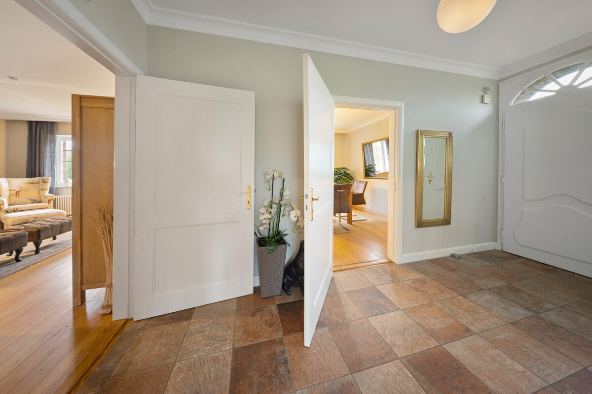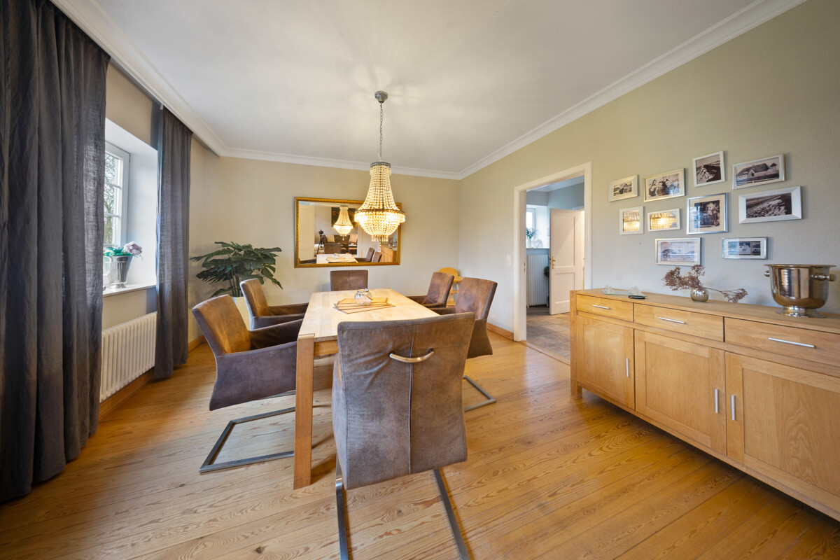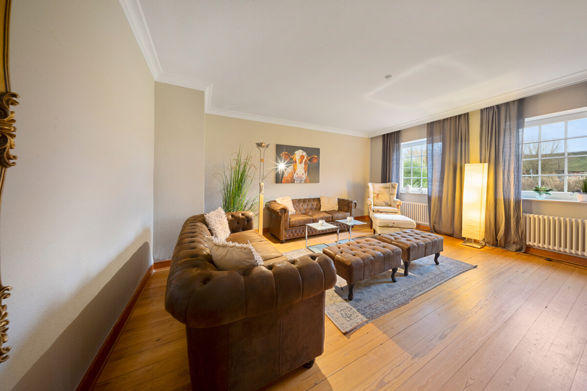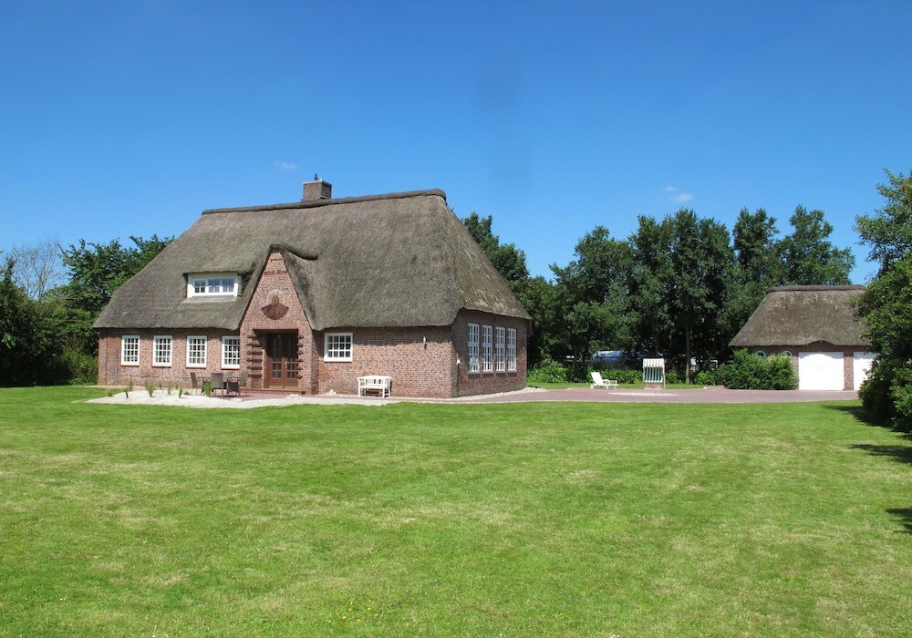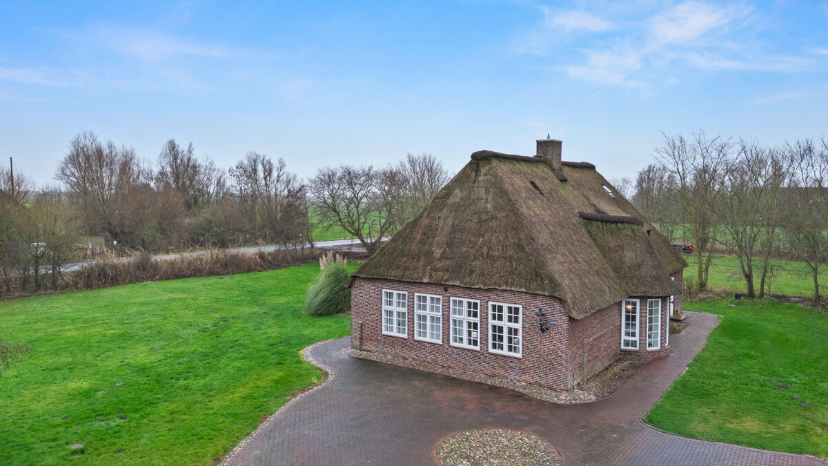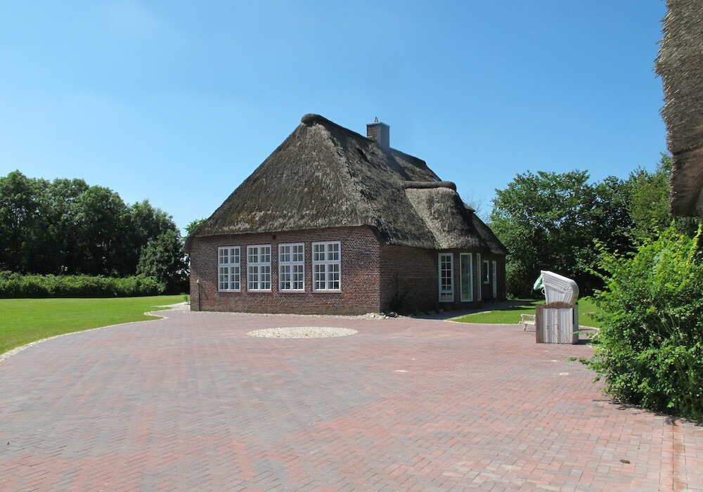 Das denkmalgeschützte Gebäude aus dem Jahr 1936 wurde ursprünglich als Schulhaus errichtet und präsentiert sich heute als außergewöhnliche Immobilie mit historischem Charakter. Aktuell ist das Objekt in zwei Doppelhaushälften aufgeteilt, die bei Bedarf baulich wieder zu einer großzügigen Einheit verbunden werden können. Insgesamt stehen ca. 240 Quadratmeter Wohnfläche auf einem weitläufigen Grundstück von rund 3.859 Quadratmetern zur Verfügung. Das reetgedeckte Haus besticht durch zahlreiche architektonische Details wie den markanten hölzernen Glockenturm als Wahrzeichen, eine Sonnenuhr im Giebel, einen Erker sowie stilgerechte Sprossenfenster. Im Jahr 2006 erfolgte eine umfassende Sanierung, bei der unter anderem Fenster, Haustüren, Fußböden und die Elektrik erneuert sowie das Dachgeschoss zu Wohnzwecken ausgebaut wurden. Die Außenanlagen umfassen ein Garagenhaus mit Reetdach und Abstellraum, ein schmiedeeisernes Eingangstor sowie einen aufwendig gestalteten Vorplatz. Beheizt wird die Immobilie über eine Öl-Zentralheizung mit 7.500-Liter-Tank.