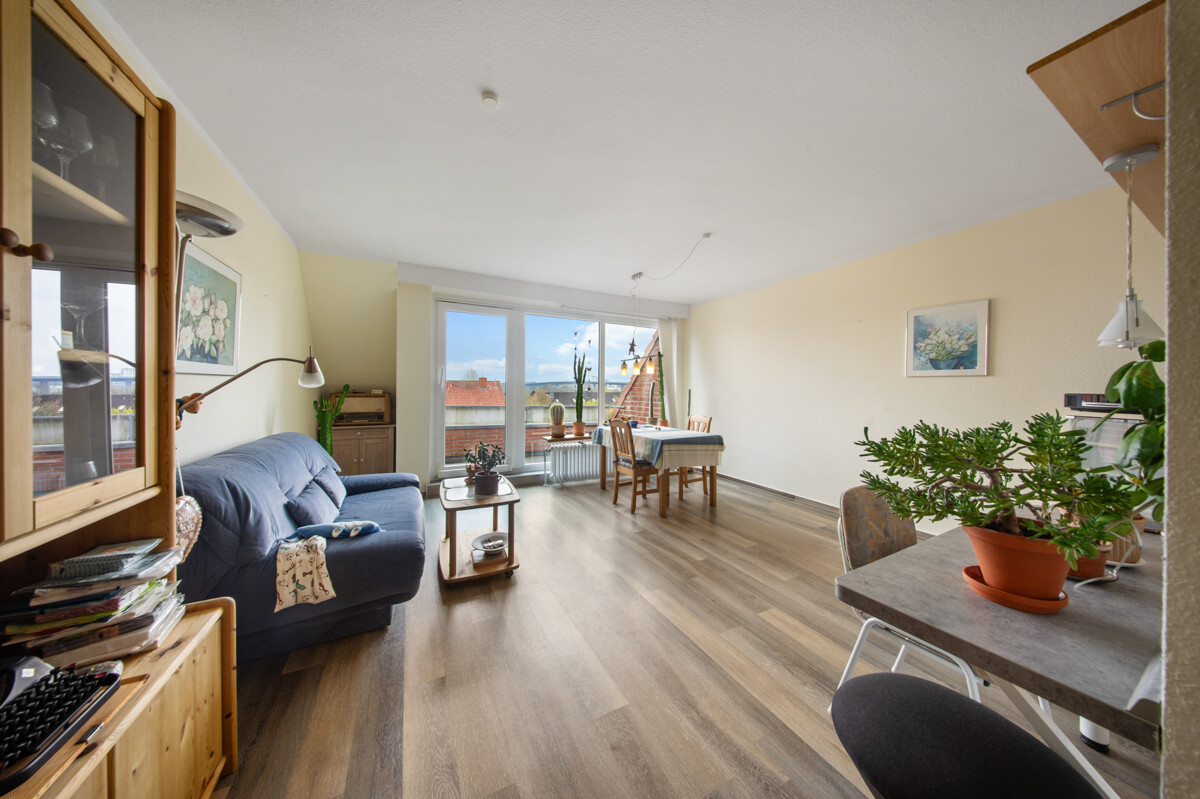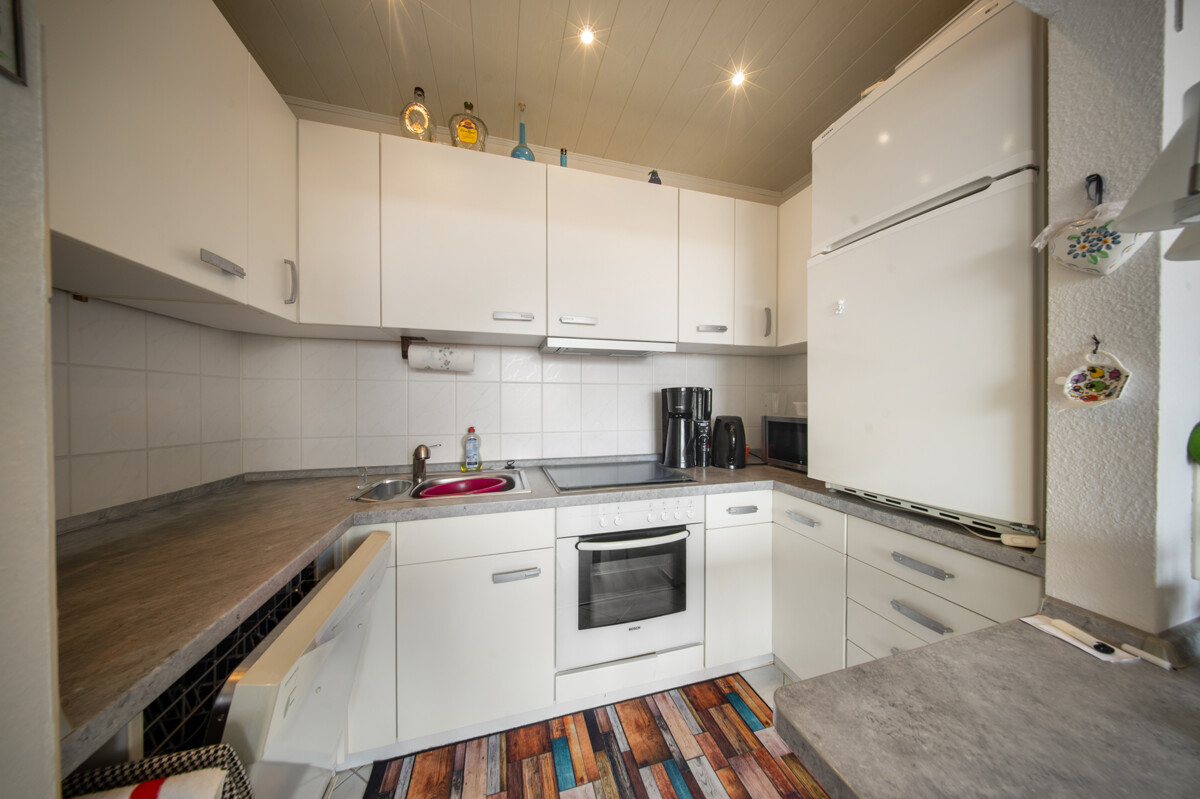 Der offene Wohn- und Essbereich bildet das Zentrum der Wohnung und schafft ein modernes, kommunikatives Wohngefühl. Die integrierte Küchennische fügt sich harmonisch in den Raum ein und ermöglicht kurze Wege sowie eine effiziente Nutzung der Fläche.
